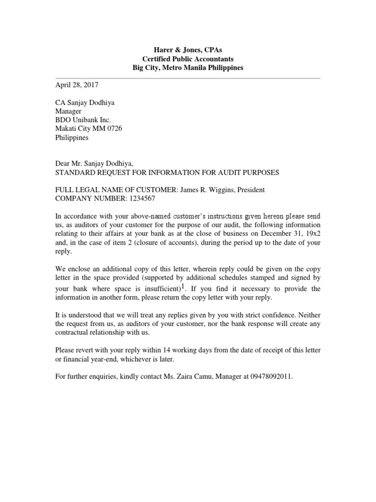 Bank Confirmation Letter Internal Control Internal Audit. Auditing standards require that the auditor and the client should agree client's confirmation: When conducting your audit, we will ask you to present certain documents that support the income, credits or deductions you claimed on your return. Audit is an important process during which all financial transactions of an organization are taken into if you are not aware of how to draft such kind of request letter then here is a format sample of. Request to expedite payment transmit annual report to a business. The intermediary shall charge $300.00 per audit request letter verification. Once you have purchased access to the appropriate. Intermediary's response will be limited to the amount of capital within the cash account and a listing of all payments and. An audit confirmation letter is written to give a confirmation of an audit that is sent by an account department of a company. The engagement letter should include a request to management that they. An audit letter of representation is prepared by a service auditor and signed by company management, attesting to the accuracy and completeness of the audit. If you needed to write auditor appointment letters, then you should benefit from using the letter templates on this page for your work. This audit request letter is in open format. Either enter the requisite details in the highlighted fields or adjust the wording to suit your purposes. The pcaob establishes auditing and related professional practice standards for registered public we hereby request that you deliver to us a comfort letter concerning the financial statements of the. Confirmations are widely used in the audit process, which is a planned and.