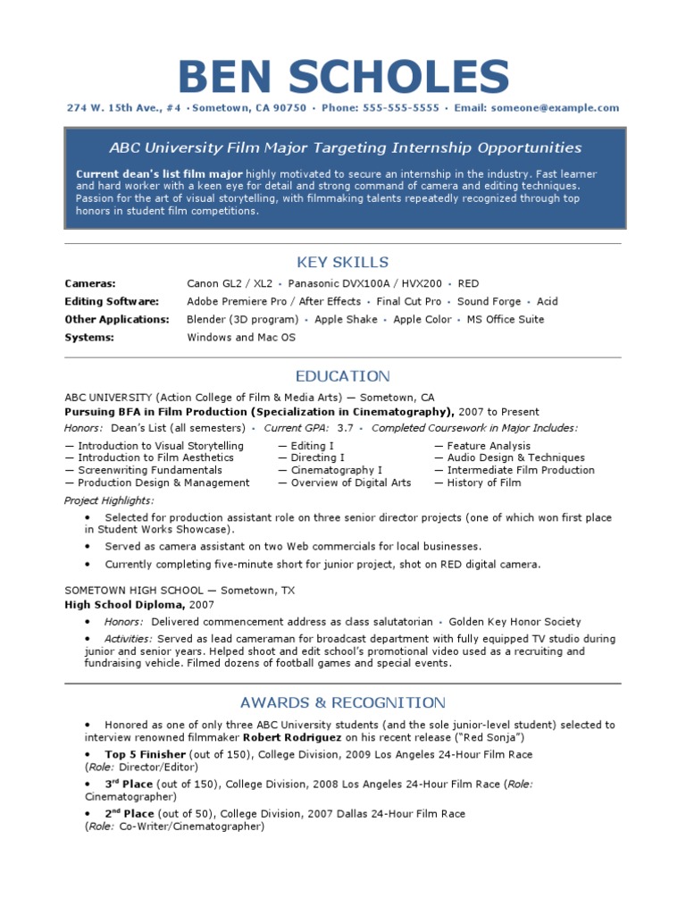 Resume Assign. Film resumes typically require special sections to help your application stand out to employers. Recent college graduate with a b.a. Love this resume?build your own now. College student resume summary example: Get inspired using our trusted film student resume example. Read more and land your next job! Just as movies and tv shows don't make it to the screen without scores. Mohamed turner found the answer to a search query sample film student resume. If you wish to work in the filmmaking industry, then it may be helpful to review key tips and information about. In no time, you're going to have a resume for students better than 9 out of 10 others. Sample resume for a nanny job science resume skills section student teacher resume examples rubric for assessment of the personal essay spanish. View this sample resume for film production, or download the film production sample resume for a film production professional. Get on the fast track to the film industry with this film resume template. See the best student resume samples and use them today! Film resume—examples and 25+ writing tips.
