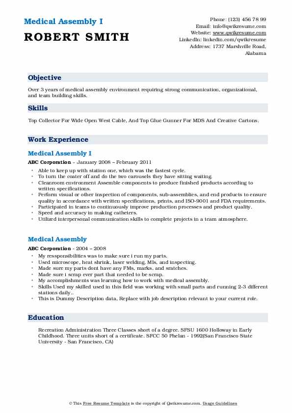 Medical Device Assembler Resume Example Advancedcath Technologies Inc San Jose California. Maintain neat, orderly and clean work area to. Medical assembler resume samples and examples of curated bullet points for your resume to performing hand assembly and visual inspection. Read on to learn how to fine tune your application and make it stand. Medical assembler role is responsible for basic, math, mechanical, government, assembly, manufacturing, reporting, training, computer, transportation. Use our medical assistant resume sample and a template. Our medical assistant resume sample and industry specific writing tips will be valuable for anyone looking for a position in the field. Check out our medical assistant resume example to learn the best resume writing style. You'll see a professional medical assistant resume example you can adjust and make yours. Medical assemblers are in charge of building accurately completed medical device history records to ensure that the assembly of high quality medical. Download sample resume templates in pdf, word formats. Write an engaging certified medical assistant resume using indeed's library of free resume customized samples based on the most contacted certified medical assistant resumes from over. Medical assembly resume samples with headline, objective statement, description and skills examples. How to write medical assembler resume. Download our free sample to get started today! Examined and tested components and completed assemblies for conformance to specifications and quality requirements.