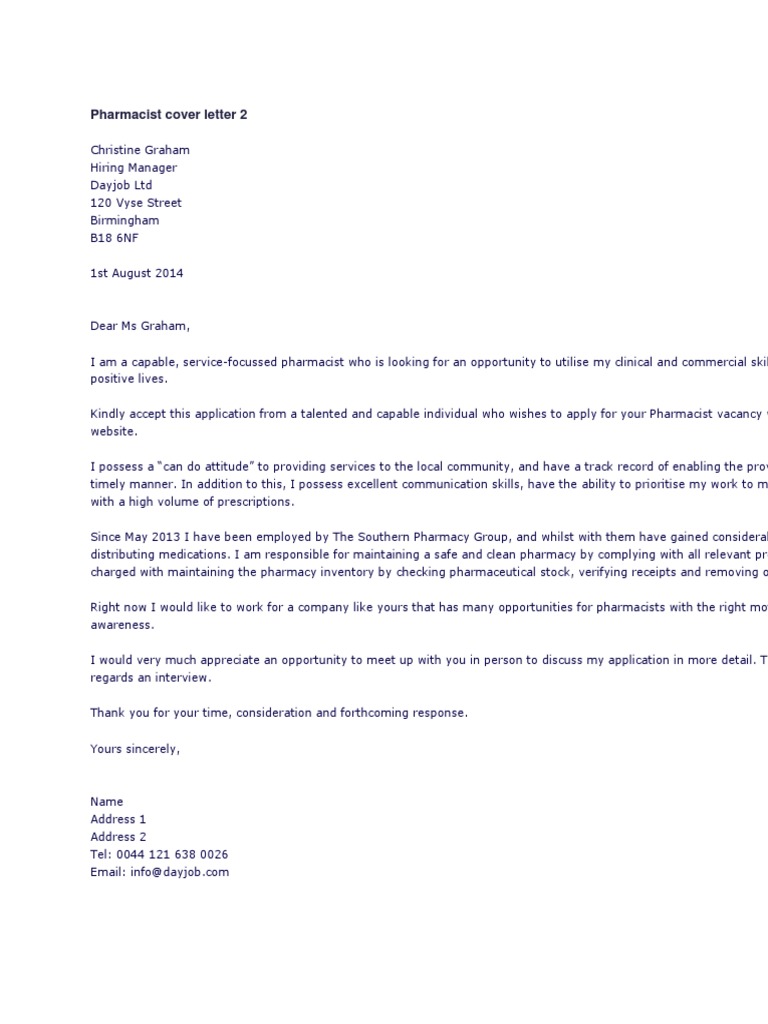 Pharmacist Cover Letter Sample. Pharmacist cover letter sample (text). Pharmacists work in retail or hospital pharmacies and are in charge for dispensing prescriptions and purchasing medicines. Write an engaging pharmacist cover letter with indeed's library of free cover letter samples and templates. I would like to thank you for taking the time to consider my interest in becoming a valuable asset as a pharmacist for your company. Pharmacy is a highly specialist area of medical work and there is no room for getting a cover letter. From margaret nelson 728 freon street oop cottage you add your own creativity to the above two sample pharmacist cover letters and write your own letter. Sample cover letter for pharmacist. Pharmacist cover letter sample 1: With our free downloadable pharmacist cover letter example and professional writing guide, you have the prescription to impress any hiring manager and start landing interviews. View livecareer's professionally written cover letter examples to see where yours stands. Get your next job with the help of indeed career advice. Need help making your pharmacist cover letter stand out? Related pharmacy technician cover letters pharmacy assistant cover letter sample pharmaceutical sales manager cover letter example A pharmacist cover letter should emphasize customer service and adherence to industry standards. She is applying for a position as a pharmacist at a number of different.